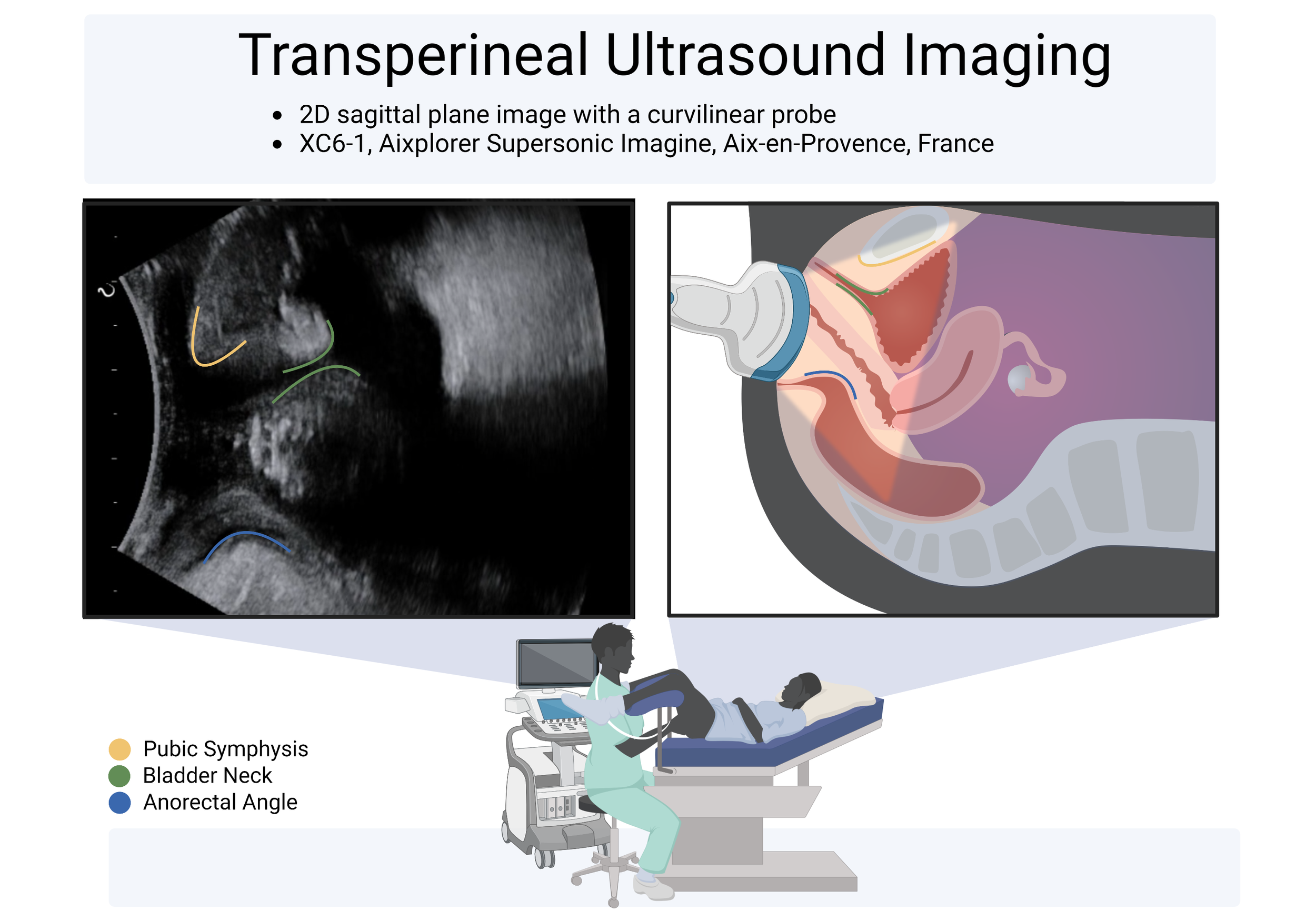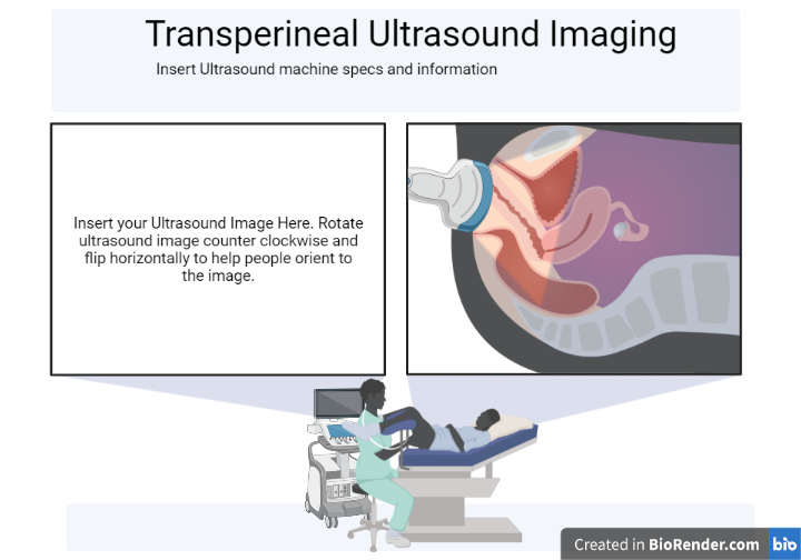 This template was made in BioRender for displaying transperineal ultrasound images. Ultrasound images can be quite tricky to present as it is difficult to orient your audience to the image. BioRender does not currently have a template or series of icons depicting this process and as such, I created an icon of a healthcare provider imaging an individual’s pelvic organs. The figures were created in Adobe Illustrator to match BioRender’s style. I have also used Adobe Illustrator to depict the pelvic organs in a side view to help viewers compare the ultrasound image to the anatomy.