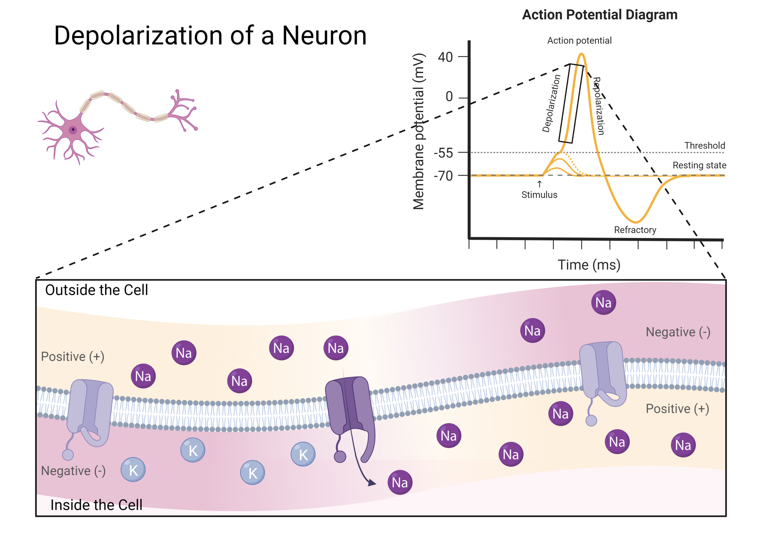 This illustration depicts the depolarization of a neuron in a very simple diagram. The goal was to show the main mechanism that swaps the charges across the membrane of one section of the action potential.