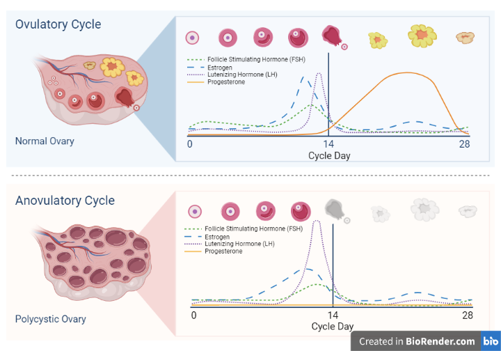 This illustration depicts a typical menstrual cycle with ovulation and the related hormone fluctuations. Below, we have an atypical menstrual cycle without ovulation (anovulatory) which is common in individuals with polycystic ovarian syndrome (PCOS).