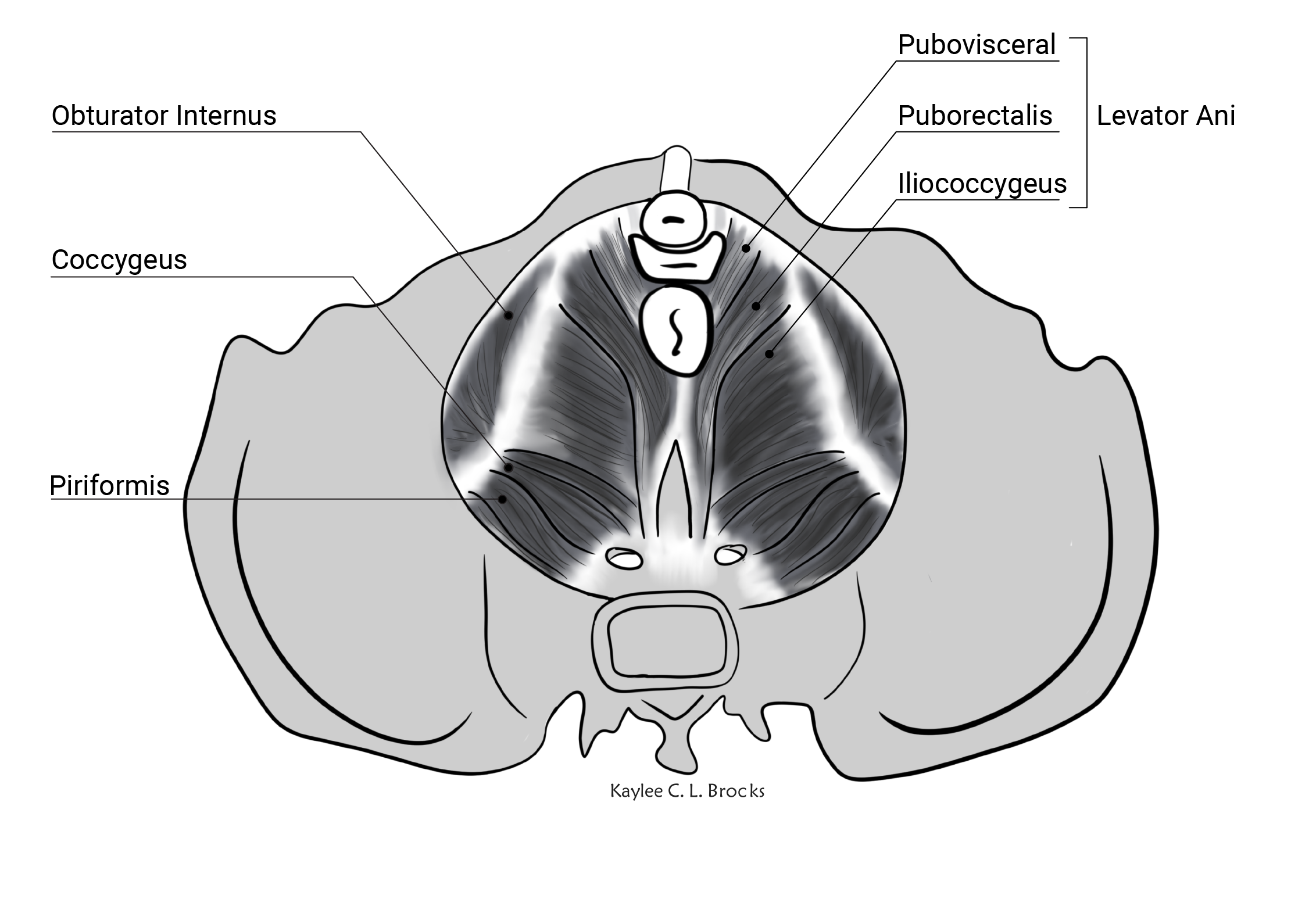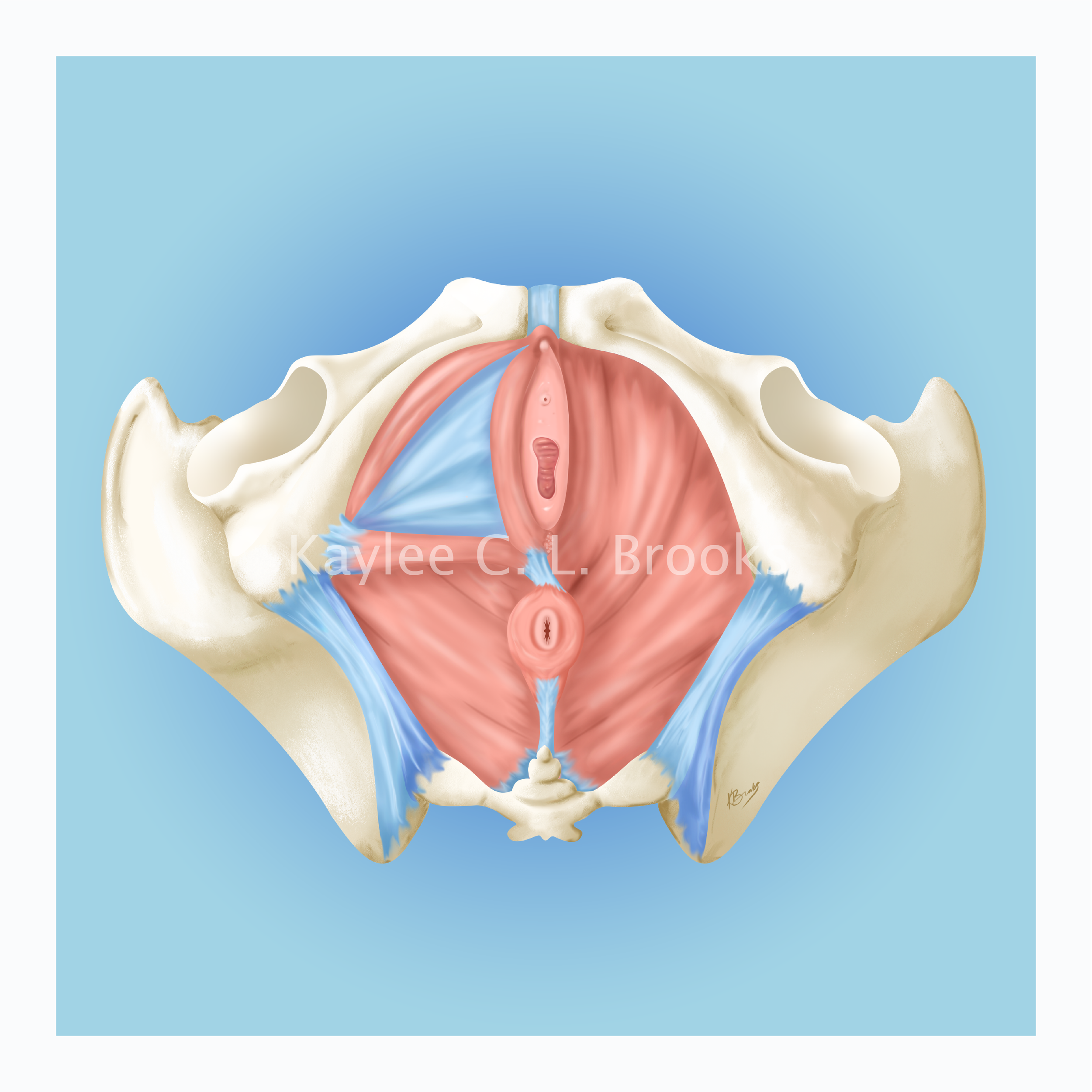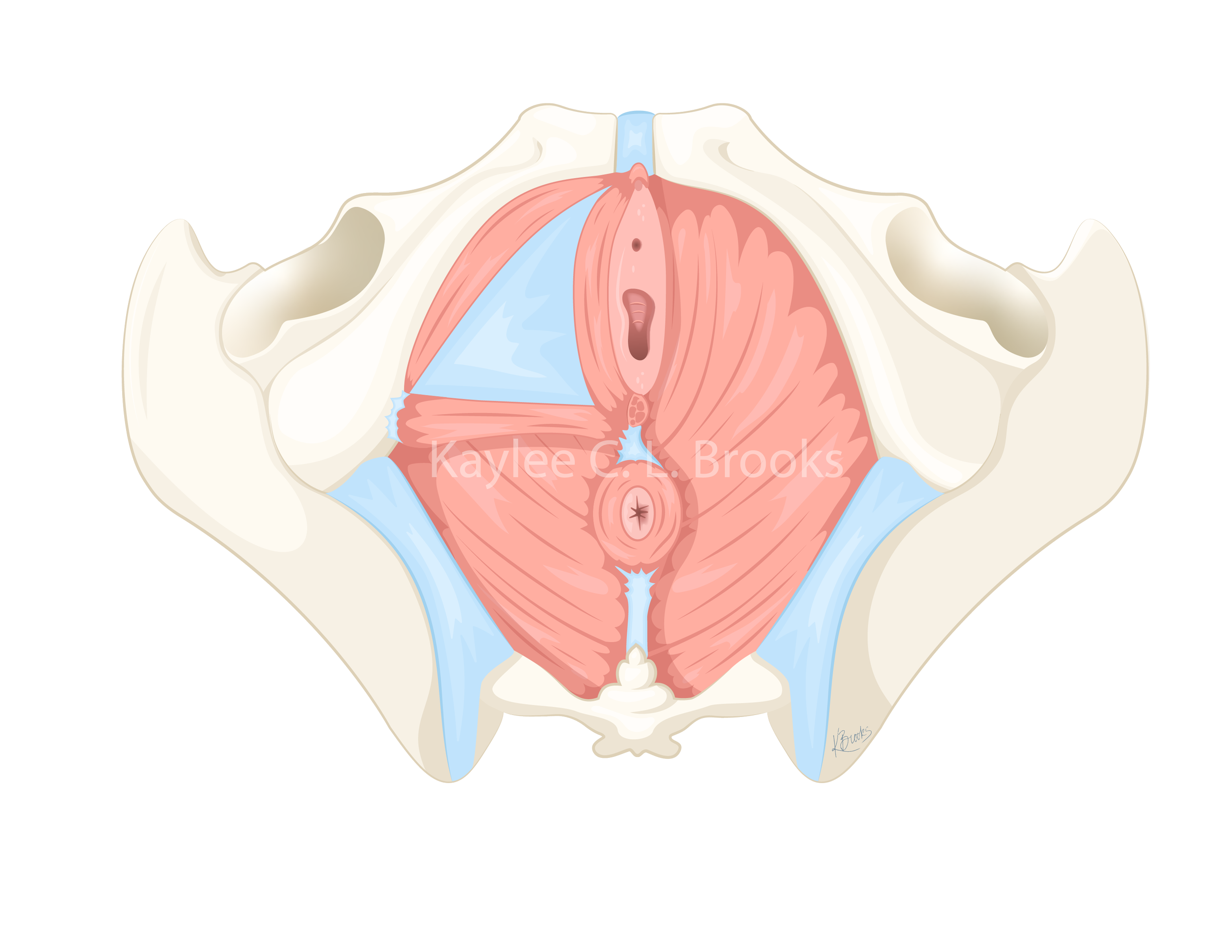 Deep pelvic floor muscles in a top down view illustrated using Krita and Adobe Illustrator.