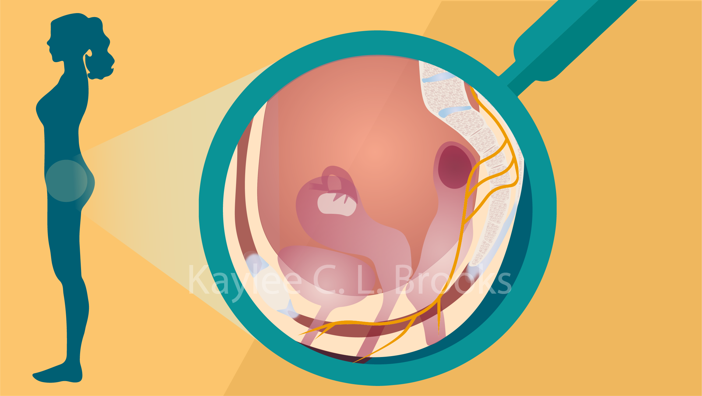 Side profile of woman and a zoom in on pelvic organs, highlighting the pudendal nerve innervation of these structures - Illustrated with Adobe Illustrator